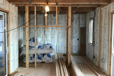 あつまる。にわ。かたち。工事の進捗。 筋交いなどの構造二次部材は取り付いて、間仕切りの下地を施工しつつ外壁の断熱材をいれはじめています...