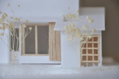 愛知県犬山市、新たに造成された小高い敷地に建つ小住宅。 格子戸を抜けて玄関戸を空けると、1.5層の高さをもつ 土間玄関...
