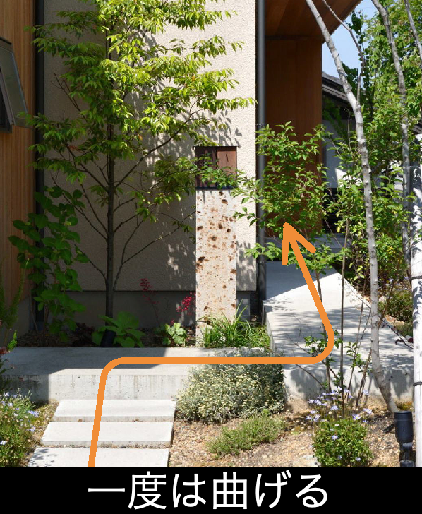 できれば道路から玄関まで距離を取ろう。とれなければ一度曲げるなどの工夫もよし。コストが許せば中庭や門扉を挟むとよりoK。